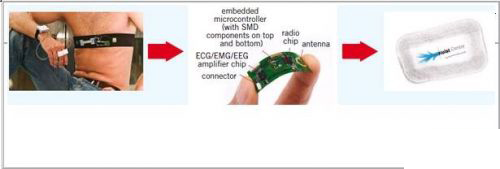 IMEC和霍爾斯特中心正在開發(fā)一款心電圖綁帶,該產(chǎn)品像運動員所用的傳統(tǒng)心臟監(jiān)測帶一樣使用。這款帶子不僅能監(jiān)測心跳,還可以記錄和傳送完整的心電圖。該設(shè)備可供有心臟病的戶外活動愛好者非常方便地使用,或在競技活動中使用(這款帶子已經(jīng)在布魯塞爾馬拉松里進行過測試)。目的難題在于要將系統(tǒng)小型化和實現(xiàn)足夠水平的自立性。根據(jù)應用的不同,可能是要能使用幾天或永久性使用。最終目標是要將這款電子心臟專家集成到一個小盒子中,而這個小盒子要能附著在一條帶子上(圖4),或者能嵌入到一件襯衫里則更好。
