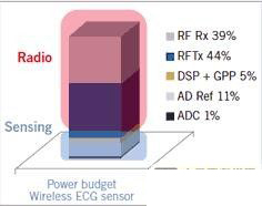 圖6:另一個降低傳感器節(jié)點功耗的途徑是使用專用的超低功率射頻組件來代替非專門設(shè)計的低功率射頻組件。若用IMEC的BAN射頻組件替代現(xiàn)貨供應的Zigbee這類射頻組件來傳輸未經(jīng)處理的心電圖,能將整個系統(tǒng)功率降低10倍。