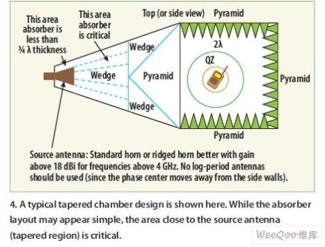 圖4:在典型的錐形暗室中,吸波材料的布局看起來很簡(jiǎn)單,但離源天線較近的區(qū)域(錐形暗區(qū)域)非常重要。