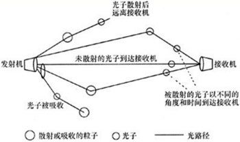 對天氣非常敏感是FSO的另一個主要問題。晴天對FSO傳輸質(zhì)量的影響最小,而雨、雪和霧的影響較大。據(jù)測試,F(xiàn)SO 受天氣影響的衰減經(jīng)驗值分別為:晴天,5~15dB/km;雨天,20~50dB/km;雪天,50-150dB/km;霧天,50~300dB/km??梢娪绊懽畲蟮氖庆F天,這是因為霧中的散射粒子的半徑與激光的波長在同一數(shù)量級上,而且散射粒子非常集中,從而使光線的傳播方向發(fā)生偏轉(zhuǎn),造成空間、角度和時間上的擴展,如圖2。對于這種大氣現(xiàn)象處理的方式,與微波通信中對待雨衰相似。要在系統(tǒng)傳輸?shù)挠嬎阒校瑸楣庑盘柕乃p留有足夠的系統(tǒng)功率余量,以便在出現(xiàn)濃霧最大衰減的情況下,仍能接收到所需的光信號功率。重要的是,要獲得所在地長期的氣象統(tǒng)計資料,能夠知道不同等級(能見度)的霧,即不同衰減的大氣介質(zhì)出現(xiàn)的統(tǒng)計規(guī)律。如果了解到衰減值大于某一指標(biāo)出現(xiàn)的概率,就能確定光無線系統(tǒng)為了保證可用性的指標(biāo)(比如99.9%),需要容納多大的大氣損耗。而傳輸距離的計算公式如式(1)所示。