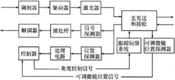 隨著通信技術(shù)的發(fā)展,對FSO系統(tǒng)的傳輸速率和距離均提出了更高的要求,如果要提高這兩個技術(shù)指標(biāo),就必須要增大激光器的發(fā)射功率和提高接收機的靈敏度,但擴束法和多束法對性能指標(biāo)的改善有限,于是動態(tài)跟蹤法就應(yīng)運而生,即利用伺服系統(tǒng)通過反饋裝置獲得光束偏差信息,調(diào)整可調(diào)微鏡,使光束時刻對準(zhǔn)接收器。采用動態(tài)跟蹤技術(shù)的FSO系統(tǒng)設(shè)備功能結(jié)構(gòu)如圖3所示,一般采用雙反饋方式,外反饋是位置探測器輸出的入射激光束的位置誤差信號,內(nèi)反饋是伺服系統(tǒng)控制的可調(diào)微鏡的位置信號,入射激光束通過接收光學(xué)系統(tǒng)后,聚集到位置探測器上,位置探測器將激光束的位置誤差信號輸出到主處理器。同時可調(diào)微鏡位置探測器將探測到的微鏡位置信號送到控制處理器中,控制處理器利用優(yōu)化的跟蹤算法進行計算,輸出的角度控制信號控制伺服系統(tǒng)調(diào)整可調(diào)微鏡,使接收光學(xué)系統(tǒng)始終對準(zhǔn)入射激光束。
