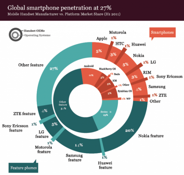 就智能手機(jī)市場領(lǐng)導(dǎo)者而言,當(dāng)前的競爭是在iPhone和Android之間展開的,原因是前手機(jī)行業(yè)領(lǐng)導(dǎo)者諾基亞對iPhone的出現(xiàn)反應(yīng)遲緩,因此在高端智能手機(jī)市場上所占份額正在穩(wěn)步下滑。諾基亞已決定從Symbian系統(tǒng)轉(zhuǎn)向Windows Phone系統(tǒng),這一決定不僅令三星、HTC、摩托羅拉、LG和索尼等Android廠商獲得優(yōu)勢,同時(shí)也令華為、中興、宏碁、戴爾和華碩等后來者受益。