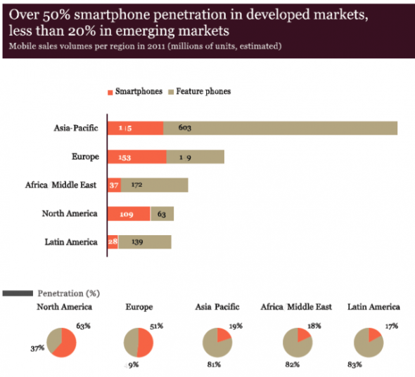 在北美和歐洲市場上,智能手機(jī)滲透率是最高的,在各自市場上所占份額分別為63%和51%。相比而言,亞太地區(qū)、非洲和中東地區(qū)、以及拉美地區(qū),滲透率則要低得多,依次分別為19%、18%和17%。