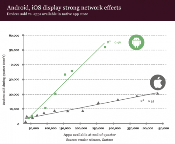 對于未來手機(jī)市場將如何發(fā)展,以及非智能手機(jī)市場將在何時(shí)向智能手機(jī)轉(zhuǎn)變等問題,這份報(bào)告并未加以猜測,但對于當(dāng)前占據(jù)市場主導(dǎo)地位的從業(yè)者的網(wǎng)絡(luò)效應(yīng)則作出了闡述。報(bào)告指出,目前占據(jù)優(yōu)勢地位的智能手機(jī)平臺(tái)之所以能取得成功,不光是由于技術(shù)因素,同時(shí)也是由于其應(yīng)用生態(tài)系統(tǒng)。50多萬個(gè)iOS應(yīng)用和30萬個(gè)Android應(yīng)用已令這兩個(gè)平臺(tái)都達(dá)到了“關(guān)鍵多數(shù)”的水平,而一旦達(dá)到這一水平,那么智能手機(jī)平臺(tái)就將開始以指數(shù)方式取得增長。但是,應(yīng)用的數(shù)量并非智能手機(jī)平臺(tái)長期健康性的最終衡量標(biāo)準(zhǔn),真正的標(biāo)準(zhǔn)應(yīng)該是開發(fā)者生態(tài)系統(tǒng)的可持續(xù)性。