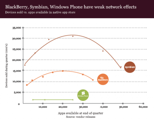 一件有趣的事情是,從手機(jī)應(yīng)用這方面來看,所有排名靠前的智能手機(jī)廠商的網(wǎng)絡(luò)效應(yīng)都能表明其產(chǎn)品的受歡迎度。以上圖表顯示的是某一特定時(shí)間點(diǎn)在某一特定平臺(tái)上的應(yīng)用數(shù)量,以及這一時(shí)間點(diǎn)以前的一個(gè)季度中該平臺(tái)的手機(jī)出貨量數(shù)據(jù)。由此得出的圖表證明Android和iOS備受歡迎,同時(shí)也表明對于另一個(gè)競爭對手來說,想要成為第三大平臺(tái)有多么困難。