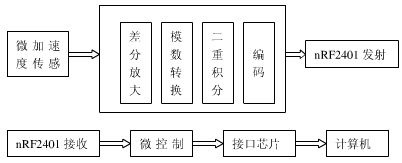 鼠標(biāo)在人的操縱下移動(dòng),微加速度傳感器便會(huì)實(shí)時(shí)地輸出鼠標(biāo)運(yùn)動(dòng)的加速度大小和方向,ADXL203傳感器的量程為±1.7gn ,電壓靈敏度為1000mV/gn,這個(gè)電壓信號(hào)經(jīng)過差分放大5.0/1.7倍后,通過微控制器A/D轉(zhuǎn)換功能變成與加速度大小對(duì)應(yīng)的數(shù)字信號(hào),加速度經(jīng)過兩次積分,便變成了鼠標(biāo)移動(dòng)的位移信號(hào),然后,再經(jīng)過編碼,并通過nRF2401射頻收發(fā)器將位移信號(hào)發(fā)射出去。