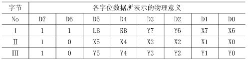 編碼的目的是將X和Y方向的位移改變量,連同鼠標(biāo)按鍵的實(shí)時(shí)信息,按照標(biāo)準(zhǔn)的Microsoft鼠標(biāo)協(xié)議要求的格式進(jìn)行編碼,以便最后發(fā)送到主機(jī)的信息能夠被電腦正確識(shí)別,從而使電腦能正確處理發(fā)送給它的位移信號(hào),來正確控制鼠標(biāo)光標(biāo)的移動(dòng)等動(dòng)作。表1表示的即是標(biāo)準(zhǔn)的鼠標(biāo)協(xié)議規(guī)定的三字節(jié)數(shù)據(jù)包格式,第1個(gè)字節(jié)記錄的是左右按鍵的信息和鼠標(biāo)X,Y位移的最高2個(gè)字位的數(shù)據(jù),按鍵按下時(shí),對(duì)應(yīng)的位置1,否則,置0;第2和第3個(gè)字節(jié)分別記錄X和Y方向位移的低6位數(shù)據(jù)。位移值的范圍取-127~+127,再大的位移改變量會(huì)自動(dòng)溢出。
