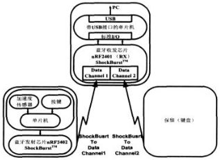 nRF2402是單片2.4 ~2.5GHz射頻發(fā)射芯片, 發(fā)射器包含頻率合成器、功放、晶體振蕩器和調(diào)制器 ,輸出功率和信道選擇很容易通過3-線接口編程實(shí)現(xiàn), 在輸 出功率為-5dBm時(shí)電流消耗僅10mA ,內(nèi)置的ShockBurst技術(shù)以及休眠模式用來降低發(fā)送數(shù)據(jù)的電流消耗 ,以延長(zhǎng)電池使用壽命 ,并且向pc發(fā)送的數(shù)據(jù)包也應(yīng)盡可能少(取采樣速率為100采樣點(diǎn)/秒)。ShockBurst技術(shù)使用片內(nèi)先入先出堆棧(FIFO)低速處理數(shù)據(jù)(10Kbps)而高速發(fā)送數(shù)據(jù)(1Mbps)。