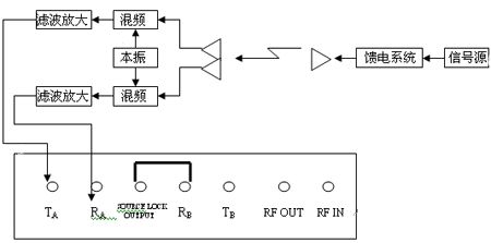 信號源輸出頻率為f1的信號,經(jīng)天線陣列饋電系統(tǒng)后由天線輻射出去,兩個(gè)接收天線的接收信號經(jīng)混頻變?yōu)轭l率為f2的信號,再經(jīng)濾波放大后分別饋入3630A的TA、、RA端。