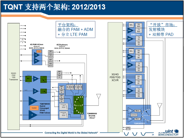 對(duì)于多頻多模的3G/4G手機(jī),針對(duì)射頻前端器件的設(shè)計(jì)如何實(shí)現(xiàn)集成?熊挺表示,目前有兩種方案:一種是融合架構(gòu),將不同頻率的射頻功率放大器PA集成;另一種架構(gòu)則是沿信號(hào)鏈路的集成,即將PA與雙工器集成。兩種方案各有優(yōu)缺點(diǎn),適用于不同的手機(jī)。融合架構(gòu),PA的集成度高,對(duì)于3個(gè)以上頻帶巨有明顯的尺寸優(yōu)勢(shì),5-7個(gè)頻帶時(shí)還巨有明顯的成本優(yōu)勢(shì)。缺點(diǎn)是雖然PA集成了,但是雙工器仍是相當(dāng)復(fù)雜,并且PA集成時(shí)有開(kāi)關(guān)損耗,性能會(huì)受影響。而對(duì)于后一種架構(gòu),性能更好,功放與雙功器集成可以提升電流特性。所以TriQuint可以提供兩種架構(gòu)的方案,大于6個(gè)頻段時(shí)(指3G和4G)采用融合架構(gòu),而小于四個(gè)頻段時(shí)采用PA與雙工器集成的方案PAD。