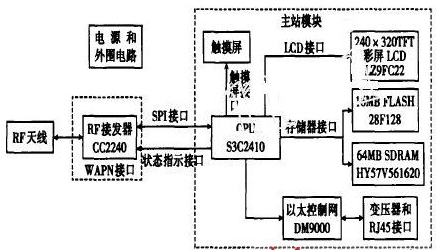 CPU部分完成主站各組成部分的控制、協(xié)調(diào)和數(shù)據(jù)的加工。具體功能:通過系統(tǒng)總線與存儲器相連,完成相關數(shù)據(jù)的加工、處理和存儲;通過LCD接口與彩色液晶顯示器相連,實現(xiàn)信息的顯示,以實現(xiàn)人機交互;通過觸摸屏接口與觸摸屏相連,實現(xiàn)控制命令的輸入;通過總線接口與以太網(wǎng)控制器相連,可將檢測儀接入后臺支持網(wǎng)絡,實現(xiàn)系統(tǒng)信息的集中化管理和與后臺管理系統(tǒng)的融合;通過SPI接口和狀態(tài)指示接口實現(xiàn)對RF收發(fā)器的配置和檢測,并完成發(fā)射和接收的數(shù)據(jù)交換,實現(xiàn)與檢測儀移動終端的通信;通過電源和外圍電路,實現(xiàn)對系統(tǒng)的供電。