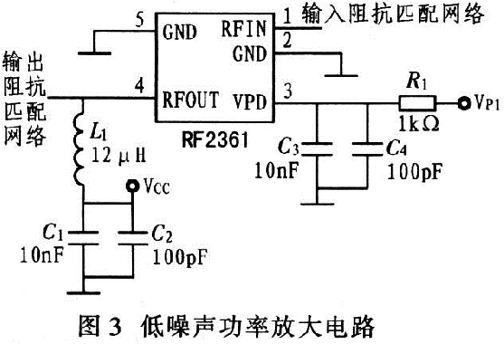 以低噪聲功率放大器RF2361為核心設(shè)計的低噪聲功率放大電路,如圖3所示,其VPD引腳上的并聯(lián)電容器實現(xiàn)電源VPD的濾波,RFOUT引腳上的電感電容串并聯(lián)網(wǎng)絡(luò)可對電源VCC濾波。
