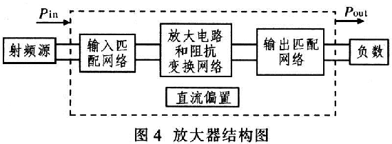 典型的放大器一般包括輸入匹配網(wǎng)絡(luò)、晶體管放大電路、阻抗變換網(wǎng)絡(luò)、直流偏置和輸出阻抗匹配網(wǎng)絡(luò),如圖4所示。確定阻抗匹配網(wǎng)絡(luò)中元件的參數(shù)、類型以及連接關(guān)系是實現(xiàn)匹配網(wǎng)絡(luò)的關(guān)鍵。阻抗匹配是射頻電路設(shè)計的重要問題,其目的是為了實現(xiàn)能量的最大功率傳輸,提高能量的傳輸效率?! ?/p>