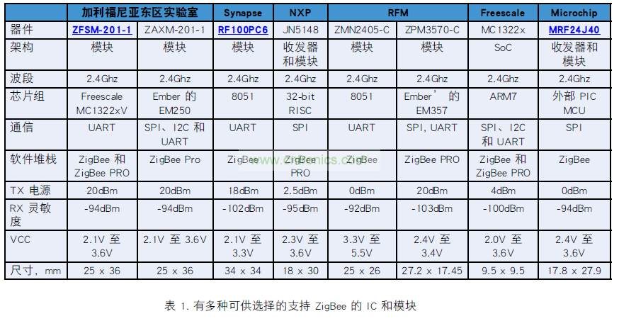 IC 和模塊中都提供有 ZigBee 解決方案(見表1)。 商業(yè)使用本規(guī)范不收取費用 - 制造商必須屬于 ZigBee 聯盟,最終產品必須