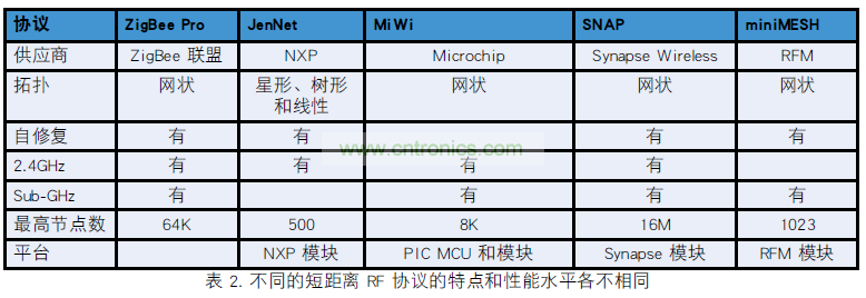 使用芯片制造商開發(fā)的專有協議可免去 ZigBee 許可證費(見表 2)。 NXP 提供 JenNet 協議,該協議在 2.4GHz 波段內運行,能組建樹狀、星狀和線性自修復網絡,最高包含500 個節(jié)點。 Microchip 的免費 MiWi 堆棧同時以 sub-GHz和 2.4GHz 兩種頻率,在 PIC 微控制器和 Microchip 收發(fā)器上運行。