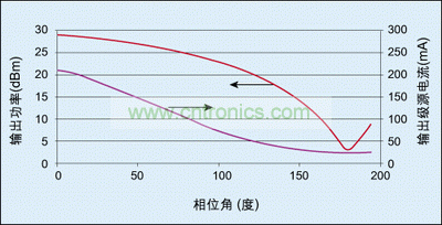 圖3顯示了輸出功率和輸出級源電流與放大器驅動信號相位角之間的關系,該圖數據得自于一個運行在5.25GHz、Vdd為5V的放大器。請記住,放大器已進入深度飽和,因而工作在恒定的電壓振幅下,但要注意源電流與異相角有很大的關系。這說明每個放大器的阻抗(往合并器方向看)在低輸出功率時確實增大,而源電流在下降。