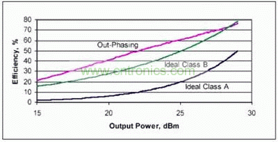 圖4可看出源電流下降的確切數量,圖中顯示了在不同輸出功率下測得的異相功率放大器的效率,它還顯示了理想B類和理想A類放大器的最大理論效率,實際的AB類放大器將在理想A類和理想B類曲線之間。注意,實際異相功率放大器測得的效率要優(yōu)于理論上完美的B類放大器。在全功率下,放大器完全工作在同相狀態(tài),可觀察到80%的效率。隨著進入放大器的信號相位減小,輸出功率也在下降,但是與典型的AB類放大器相比,效率下降要慢得多。在峰值以下7.8dB功率處(這是802.11a信號典型峰值-均值比率),放大器的效率為46%。