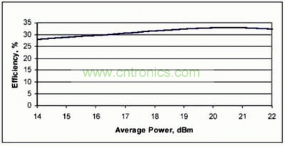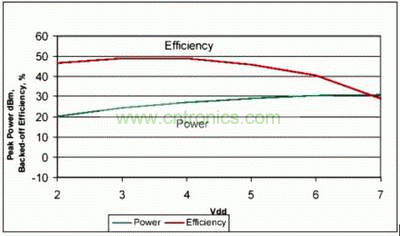 驅動級對總體功耗也有貢獻。包括驅動級在內的功率添加效率(PAE)在7.8dB后退點處大于33%,此后退效率可以在廣泛的電源中實現。圖5顯示了各種電源電壓下放大器后退7.8dB時的效率,注意,確實有兩種方式控制放大器的瞬時輸出功率,即異相和改變電源電壓。電源電壓通常用于緩慢改變平均輸出功率,相位角用于快速改變信號的瞬時包絡線。
