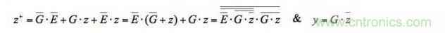 從這個(gè)公式可以看出,其中針對(duì)z+的最小項(xiàng)[E●z]不是多余的。它在最小項(xiàng)[G●E]和[G●z]之間扮演著反競(jìng)爭橋的重要角色,可以消除G的所有邊沿處的連續(xù)競(jìng)爭。