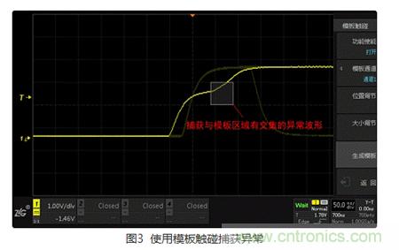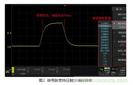 通過(guò)Step1,可以大概了解到異常信號(hào)的特性,將其特有的條件視為觸發(fā)條件,利用觸發(fā)可快速的捕獲異常信號(hào)。ZDS2000系列示波器免費(fèi)標(biāo)配了多種“觸發(fā)類(lèi)型”,其中包括11種基礎(chǔ)觸發(fā),21種協(xié)議觸發(fā)。另外,用戶(hù)還可根據(jù)波形的形狀特性,使用“模板觸發(fā)”,讓觸發(fā)更加隨心所欲。