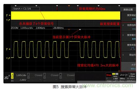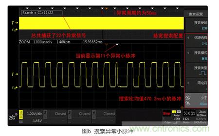 在調(diào)試異常信號(hào)時(shí),我們通常需要明確,異常出現(xiàn)的頻率是多少,是不是周期性出現(xiàn)的呢?為了弄清楚這些問(wèn)題,一般需要長(zhǎng)時(shí)間記錄波形,然后基于這樣一個(gè)龐大的數(shù)據(jù)庫(kù)去定位和分析異常。ZDS2000系列示波器標(biāo)配的“搜索功能”,可以在海量的數(shù)據(jù)中快速定位出感興趣的信號(hào),并自動(dòng)做出標(biāo)記,用戶(hù)通過(guò)觀察標(biāo)記可快速了解異常的位置、頻率、周期等特性。