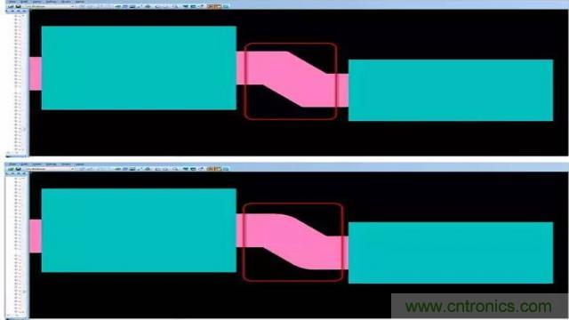設計用于射頻和微波的銅皮形狀時,一個很重要的方面是能夠創(chuàng)建帶尖拐角的Gerber 文件。優(yōu)秀的PCB設計工具可以簡化這一過程。例如,使用50 毫米線條繪制形狀與使用50 毫米圓形光圈繪圖相比,往往令設計具有較小的半徑。設計工具在創(chuàng)建Gerber 文件時,可通過正確地自動轉換線條寬度來獲得尖拐角(圖2)。