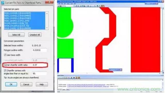 射頻和微波電路中經(jīng)常用到倒角,以減小饋線與電容器之間的分段不連續(xù)性電抗,從而改善MMIC 的頻率性能。90º 拐角與倒角之間的距離至關重要。因此,設計人員需要采用自動方法來基于設計指定需要生成的倒角比率。PCB 設計工具如果能夠基于設計規(guī)則自動強制實施需要生成的倒角比率,設計人員和工程師將會從中受益,在節(jié)省時間的同時提高設計質量(圖3)。