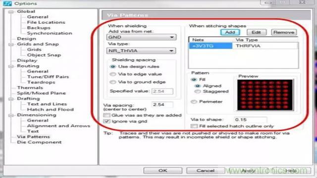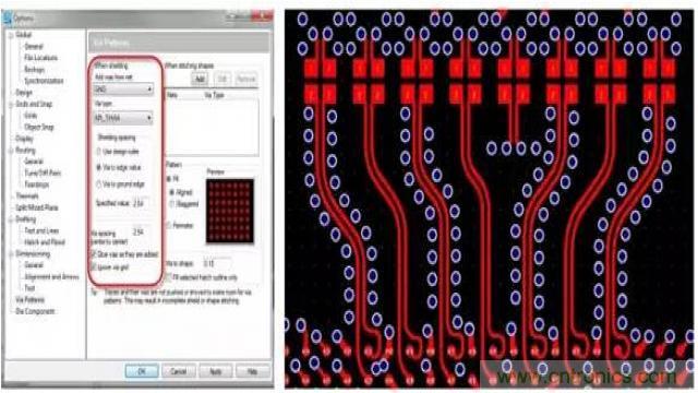 射頻設計的另一個重要方面是確保正確地屏蔽帶過孔的區(qū)域。盡管此任務可由設計人員手動進行,但這個過程極其耗時。如果PCB 設計工具能夠自動完成此過程,將可以縮短設計周期時間并確保符合您的所有設計規(guī)則。利用此類工具,設計人員可以指定過孔模式生成規(guī)則,而將剩余的工作全部交由PCB 設計工具完成。