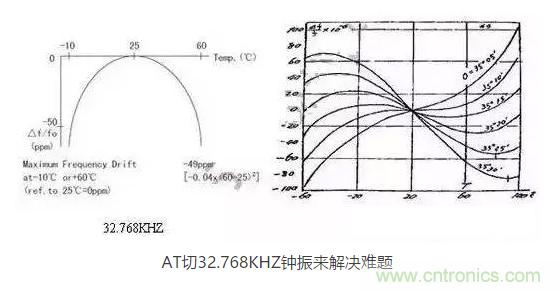 AT切晶體頻率溫度曲線為三次曲線,呈躺著的"S"型曲線,隨著溫度的變化,溫漂呈"S"型軌跡變化,大致在-10℃和+60℃時,有兩個"拐點",即溫漂又會反方向拐回來。因此,只要控制好晶片的切角在一定的公差范圍內(nèi),那么保證兩個拐點溫漂在-40℃~85℃時不超過±30ppm并不是一件難事。然而,AT切晶體只針對MHZ頻率的晶體,如何轉(zhuǎn)換成32.768KHZ頻率?鐘振32.768KHZ通過分頻方式,便可以實現(xiàn)。如采用AT切16.777216MHZ晶體,通過512分頻,那么就可以得到想要的32.768KHZ頻率。鐘振實現(xiàn)對頻率的分頻并不困難,都集成在振蕩IC內(nèi)部。因此,使用AT切MHZ 分頻實現(xiàn)的32.768KHZ鐘振,在頻率溫度特性上,有很大的改良,在沒有進(jìn)行溫度補償?shù)臅r候,-40℃~85℃條件下,溫度頻差保持在±30ppm甚至±20ppm都是可以實現(xiàn)的。
