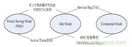 TAU周期請(qǐng)求定時(shí)器(T3412)由網(wǎng)絡(luò)側(cè)在ATTCH和TAU消息中指定,3GPP協(xié)議規(guī)定默認(rèn)為54min,最大可達(dá)310H。那么UE處理完數(shù)據(jù)之后,什么時(shí)候進(jìn)入PSM模式呢?這是由另一個(gè)定時(shí)器Activer Timer(T3324,0-255秒)決定的。UE處理完成數(shù)據(jù)之后,RRC連接會(huì)被釋放、進(jìn)入空閑態(tài),與此同時(shí)啟動(dòng)Active Timer,此Timer超時(shí)后,UE即進(jìn)入上述PSM模式。轉(zhuǎn)換狀態(tài)如下(借圖):