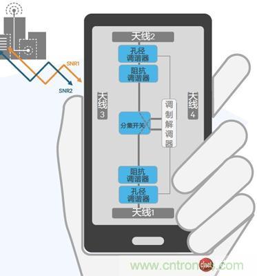 值得一提的是,高通的整合解決方案還支持載波聚合的TruSignal自適應天線調諧技術。TruSignal可被看作是三項技術的總稱:第一是主分集天線切換,它是用來解決手機“死亡之握”的問題——手機的主天線一般是在手機的下方,當人們用手握住它的時候,信號會掉得非???,當下方主天線被握死時,它可以將天線切換到上面的分集天線去;第二是天線調諧——天線調諧技術又包含兩類,一類叫孔徑調諧,一類叫阻抗調諧,通過調諧天線的匹配,可以解決天線和PA之間的適配問題;第三是高階分集接收——通過增加分集來提升接收性能,以及接收的下行速率。