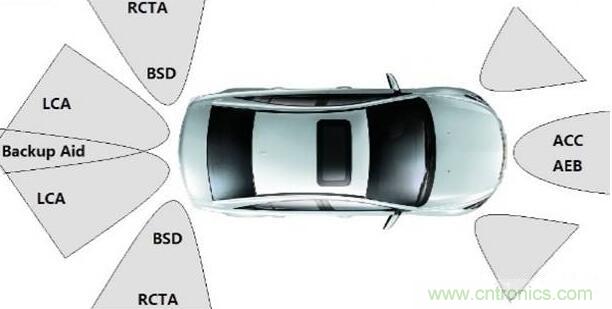 應用于汽車的防撞雷達一般工作在兩個頻段:24GHz-24.25GHz和76GHz-81GHz;工作在24GHz頻段的防撞雷達一般安裝在汽車后向,實現(xiàn)盲區(qū)監(jiān)測(BSD),變道輔助(LCA)以及倒車側向警告(RCTA)等功能;工作在76GHz-81GHz頻段的毫米波防撞雷達一般安裝在汽車前向,用于實現(xiàn)自適應巡航(ACC),緊急制動(AEB)等功能。汽車防撞雷達不同功能覆蓋區(qū)域如圖1所示: