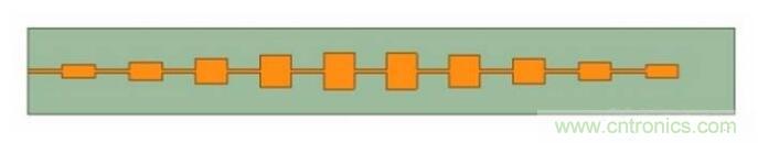 根據(jù)增益與波束寬度的要求確定該串饋微帶貼片線陣單元數(shù)為10,副瓣電平小于-20dB;采用厚度為5mil的RO3003介質基板,經理論分析與仿真軟件優(yōu)化。仿真模型如圖4所示