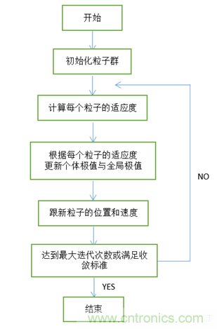 粒子群的基本概念是來自于鳥群覓食行為的研究[3]。與遺傳算法類似,粒子群算法也是一種隨機搜索方法,不同的是,粒子群優(yōu)化算法沒有選擇、交叉、變異等復雜過程,而是依靠個體間的協(xié)作來尋取最優(yōu)解。每個粒子通過跟蹤粒子本身找到的最優(yōu)解Pbest和群體找到的最優(yōu)解Gbest,更新離子的位置和速度,不斷向最優(yōu)解靠近,最終達到最優(yōu)解。粒子群算法優(yōu)化流程圖如圖7所示