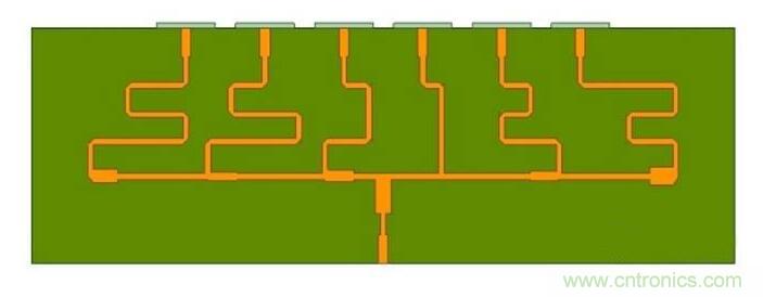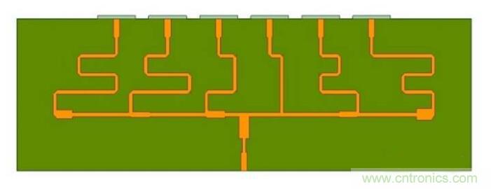 3.2節(jié)確定了各線陣激勵的幅相值,但圖8里的仿真方向圖是理想的,現(xiàn)實中需要通過1分6的功分網絡來將其實現(xiàn)。常用的功分器有Wilkinson功分器和T型節(jié)功分器;Wilkinson功分器只能組成并饋網絡,這種網絡具有較大的損耗且占用面積大,不利于小型化;而由T型節(jié)組成的串饋功分網絡具有損耗低占用面積小的優(yōu)勢,更適合于實現(xiàn)3.2節(jié)中波束賦形的幅相激勵。