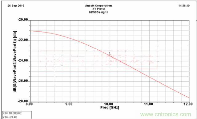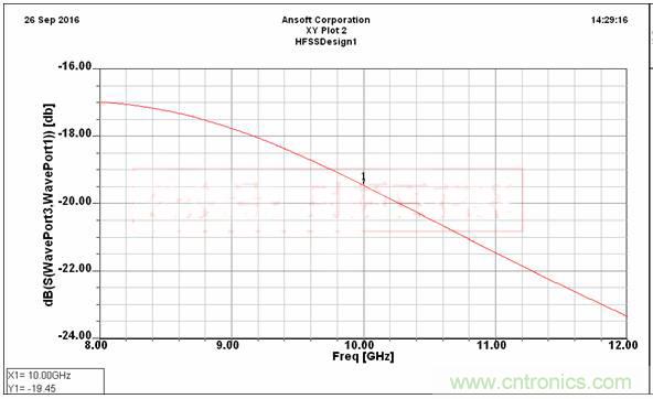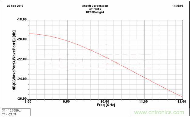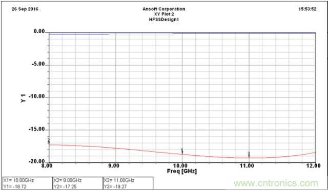 添加的C形環(huán)受到相同的磁場(chǎng)耦合,產(chǎn)生與主線相反的電流,從而對(duì)主線進(jìn)行二次耦合,增強(qiáng)了主線的耦合度。仿真了1mm耦合間距的耦合度,仿真結(jié)果如下圖4所示。在10GHz耦合-18.72dB,x波段耦合度-17.25~-19.27dB,波動(dòng)2dB左右。