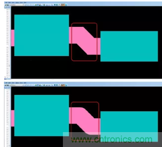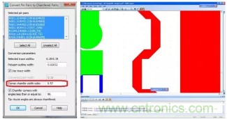 射頻和微波電路中經(jīng)常用到倒角,以減小供給線與電容之間的分段不連續(xù)性阻抗,從而改善 MMIC 的頻率性能。90º拐角與倒角之間的距離至關(guān)重要。因此,設(shè)計(jì)人員需要采用自動(dòng)方法來(lái)基于設(shè)計(jì)指定需要產(chǎn)生的倒角比率。PCB設(shè)計(jì)工具如果能夠基于設(shè)計(jì)規(guī)則自動(dòng)強(qiáng)制實(shí)施需要產(chǎn)生的倒角比率,設(shè)計(jì)人員和工程師將會(huì)從中受益,在節(jié)省時(shí)間的同時(shí)提高設(shè)計(jì)質(zhì)量(圖 3)。