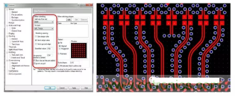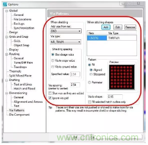 圖 5:利用支持射頻設(shè)計(jì)的PCB設(shè)計(jì)工具,您可以設(shè)定用于產(chǎn)生via模式的設(shè)計(jì)規(guī)則,并自動(dòng)在您的設(shè)計(jì)中強(qiáng)制實(shí)施這些規(guī)則,從而節(jié)省您的時(shí)間和確保符合您的所有設(shè)計(jì)規(guī)則。