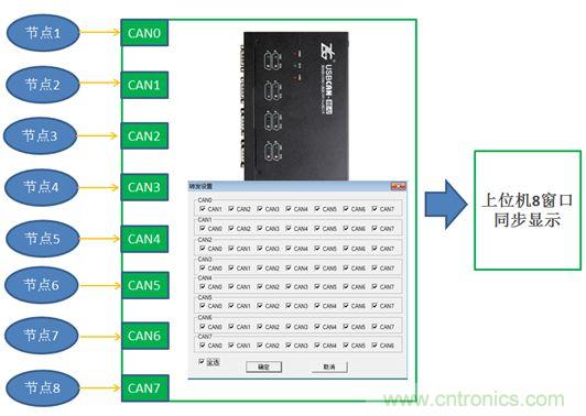 USBCAN-8E-U集成8路CAN-bus接口,各通道間可做路由(轉(zhuǎn)發(fā))功能。在識(shí)別節(jié)點(diǎn)ID時(shí),可以將節(jié)點(diǎn)同時(shí)接到8個(gè)CAN接口上,然后設(shè)置8路CAN間通信自由轉(zhuǎn)發(fā),保證原有網(wǎng)絡(luò)通信規(guī)則不受破壞。強(qiáng)大的上位機(jī)軟件將每個(gè)通道發(fā)送、接收的CAN報(bào)文按通道分開顯示,數(shù)據(jù)分析一目了然。