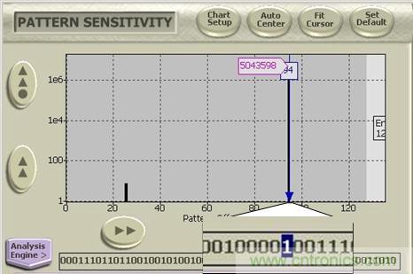 在客戶進行誤碼測試的時候,由于鏈路的損耗和芯片的輸出特性,導致出現(xiàn)了誤碼,但客戶卻想知道究竟是哪一個bit位出現(xiàn)了誤碼,以定位誤碼出現(xiàn)的根源。設(shè)置Bert的輸出/輸入端設(shè)置為PRBS7的碼型,在誤碼分析功能里面選擇Patten Sensitivity,則可以直接觀察PRBS7的127個比特的每一位所出現(xiàn)誤碼的個數(shù),看最多誤碼所對應的比特位的前后特性,如下圖十三,移動光標到任意一個比特上面,可以看到連續(xù)多個0而中間有一個1跳變的bit即127比特的第94比特出現(xiàn)誤碼的個數(shù)最多,達到5043598個誤碼。從而判斷由于鏈路ISI的影響導致突然的跳變位出現(xiàn)較高的誤碼率。