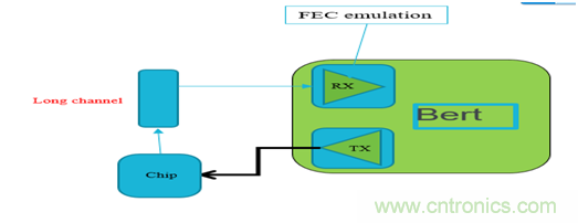 客戶的芯片的接收端可以支持FEC的糾錯功能,但要測試在不同的channel條件和不同的發(fā)送端均衡的設(shè)定下,芯片經(jīng)過FEC后的誤碼率能降低到多少,如果將信號直接環(huán)回到芯片的輸入端的話,需要不停的修改芯片的FEC的參數(shù)來進行測試,但由于其芯片每修改一次FEC的參數(shù)如FEC的symbol size, block size,content size等等都需要重新對芯片進行代碼編譯和下載,每次下載需要幾分鐘的時間,由于不同的條件都要測試,則組合數(shù)量很多,導致測試效率非常低。