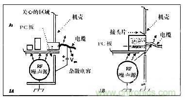 使共模電流注入到I/O區(qū)的另一機理,是附近有強的干擾源的耦合。甚至有些“屏蔽”連接器也無用,因為干擾源就在連接器附近,如PC機環(huán)境。如果在連接器和底板之間有一個缺口,此處所感應(yīng)的RF電壓可以使EMC性能下降(圖1B)。