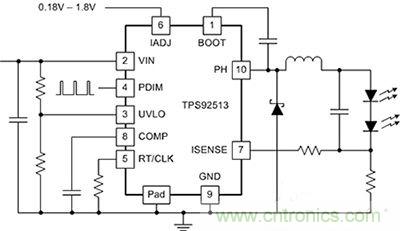 圖 2: TPS92513/HV LED 驅(qū)動器典型應用的簡化原理圖。