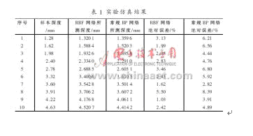 本文采用MATLAB軟件進(jìn)行仿真實(shí)驗(yàn),通過提供的40組人工裂縫的樣本,對(duì)RBF神經(jīng)網(wǎng)絡(luò)系統(tǒng)進(jìn)行訓(xùn)練學(xué)習(xí)和模式識(shí)別,并在學(xué)習(xí)初期對(duì)輸入數(shù)據(jù)進(jìn)行了預(yù)處理,通過樣本訓(xùn)練逐漸生成最佳的RBF期網(wǎng)絡(luò)[8]。另取10組測(cè)試樣本數(shù)據(jù)作為輸入,用MATLAB軟件進(jìn)行模擬仿真,同時(shí)利用RBF神經(jīng)網(wǎng)絡(luò)對(duì)其進(jìn)行深度評(píng)估,并與常規(guī)BP神經(jīng)網(wǎng)絡(luò)進(jìn)行對(duì)比,其實(shí)驗(yàn)仿真結(jié)果如表1所示。