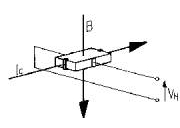 在這兩個(gè)邊緣之間產(chǎn)生的霍爾電壓VH與控制電流IC和磁通量B直接成正比(圖1)?;魻柊l(fā)生器由一片薄傳導(dǎo)材料制成,如鎵砷化物(GaAs),這種材料在使用期間能夠?qū)崿F(xiàn)可靠穩(wěn)定的性能。在5 mA的控制電流下,獲得的霍爾電壓約為1.25 mV/mT。