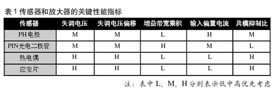 選擇放大器與傳感器正確接口時,設(shè)計人員必須使放大器與傳感器特性匹配??煽康姆糯笃魈匦詫τ趥鞲衅?mdash;—放大器組合的工作是關(guān)鍵性的。傳感器和放大器的關(guān)鍵性能指標(biāo)見表1。例如,PH電極是一個高阻抗傳感器,所以,放大器的輸入偏置電流是優(yōu)先考慮的(表中的H)。PH傳感器所提供的信號不允許產(chǎn)生任何相當(dāng)大的電流,所以,放大器必須是在工作時不需要高輸入偏置電流的型號。具有低輸入偏置電流的高阻抗MOS輸入放大器是符合這種要求的最好選擇。另外,對于應(yīng)用增益帶寬乘積(GBP)是低優(yōu)先考慮(表1中L),這是因為傳感器工作在低頻,而放大器的頻率響應(yīng)不應(yīng)該妨礙傳感器信號波形的真正再生。