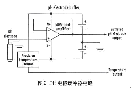 高阻抗PH傳感器可與具有低功率電路(僅需要2個1.5V電池供電)的放大器配對(圖2)。放大器MOS輸入晶體管為傳感器提供高阻抗,傳感器輸出阻抗為1MW或更大。此放大器的輸入偏置電流小于1pA,所以,放大器工作消耗非常小的電流。放大器的失調(diào)電壓小于1mV。放大器提供軌到軌工作并具有高驅(qū)動能力,能在長線上發(fā)送信號(放大器遠(yuǎn)離ADC的情況)。在電路中增加了一個精密溫度傳感器,可以測量PH傳感器的溫度。這使得具有精確的PH溫度補(bǔ)償值。