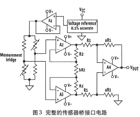 測量應(yīng)變片傳感器通常要通過橋網(wǎng)絡(luò),應(yīng)變片構(gòu)成橋的兩個(或4個)臂。應(yīng)變片是低源阻抗器件,其輸出信號范圍是小的(幾百微伏~幾毫伏)。圖3所示的電路能為精確測量傳感器信號提供測量橋穩(wěn)定激勵電壓和高共模電壓抑制(CMR),消除了任何共模電壓。用高精度和非常低漂移(隨溫度)的精密電壓基準(zhǔn)驅(qū)動放大器A1。這可為橋提供非常精確、穩(wěn)定的激勵源。因為共模電壓大約為激勵電壓的一半,所以被測信號僅僅是橋臂之間小的差分電壓。放大器A2、A3、A4必須提供高共模抑制比(CMRR),所以僅測量差分電壓。這些放大器也必須具有低值輸入失調(diào)電壓(VOS)漂移(也稱之為失調(diào)電壓溫度系數(shù)TCVOS)和輸入偏置電流,以使得從傳感器能精確地讀數(shù)。放大器A1~A4連接成儀表放大器以達(dá)到上述目標(biāo)。這種配置的電壓增益(AV)為:AV=(1+2R2/bR2)(aR1/R1),其中a和b是確定總增益的比值。