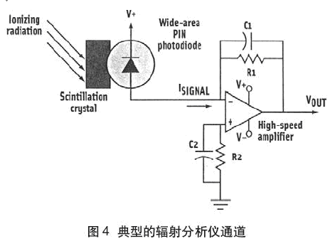 輻射譜測量來自輻射源的發(fā)射能量的分布,輻射源可以是粒子,X射線或γ射線。輻射照到閃光晶體上并發(fā)射強(qiáng)度正比于能量的短脈沖。然后由PIN光電二極管把光轉(zhuǎn)換為電流。放大器(見圖4)用做首置放大器和PIN光電二極管輸出的電流/電壓轉(zhuǎn)換器。此電路為用于基本輻射譜的單通道分析儀。信號的脈沖幅度包含重要信息,所以低輸入失調(diào)電壓和低失調(diào)電壓漂移是重要的。寬帶寬為處理脈沖(可窄到幾納秒)提供快速響應(yīng)。首置放大器輸出(VOUT)到脈沖幅度分析儀(如快速ADC)來測量和儲存每個峰值發(fā)生的數(shù)。分布是單個源的光譜。反饋電阻R1值取決于來自PIN光電二極管的最大電流和到ADC的最大輸出電壓。因此,R1=(Max VOUT)/(Max ISIGNAL)。電容C1用于PIN光電二極管寄生電容的補(bǔ)償。R2和C2相當(dāng)于R1和C1用于補(bǔ)償放大器非倒相輸入的輸入偏置電流。