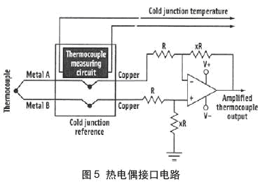 熱電偶根據(jù)兩個不同金屬線結(jié)點之間的溫度差提供電壓信號。熱電偶溫度傳感器具有一個感測端(金屬A/金屬B連接端)和一個參考端(金屬A和金屬B與銅導(dǎo)線連接端)。冷端參考溫度與熱電偶信號一道進(jìn)行控制和測量。熱電偶具有大約10mV/℃~80mV/℃的小信號電平范圍和小的源阻抗。配置成差分放大器的單放大器(圖5)把信號放大到ADC輸入所需的電平。差分放大器增益為: